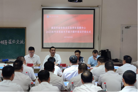 8月26日上午,襄阳市综合执法应急用车保障中心技能提升培训班在汽车工程(新能源汽车)学院开班。襄阳市综合执法应急用车保障中心主任刘曦主任、副主任赵诚奕、襄阳汽车职业技术学院副校长包科杰、汽车工程(新能源汽车)学院党支部书记秦显峰以及襄阳市综合执法应急用车保障中心全体员工、汽车工程(新能源汽车)学院培训教师参加开班仪式,开班仪式由秦显峰主持。