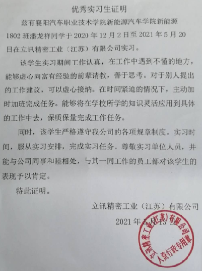 按照学校统一安排,汽车工程(新能源汽车)学院2018级400多名学生从2020年11月开始顶岗实习工作,在顶岗实习期间院系统一协调,全程跟踪管理,实时电话回访,及时解决学生实习中的问题,大多数学生克服岗位不适、心理焦虑等困难,严格按照学校顶岗实习方案开展实习工作,90%的学生得到实习单位的好评和认可。其中:新能源汽车技术专业1802班潘龙祥和王国庆两位同学因实习期间表现突出,分别受到实习单位立讯精密工业(江苏)有限公司和襄阳市第一人民医院致函我院表示感谢。