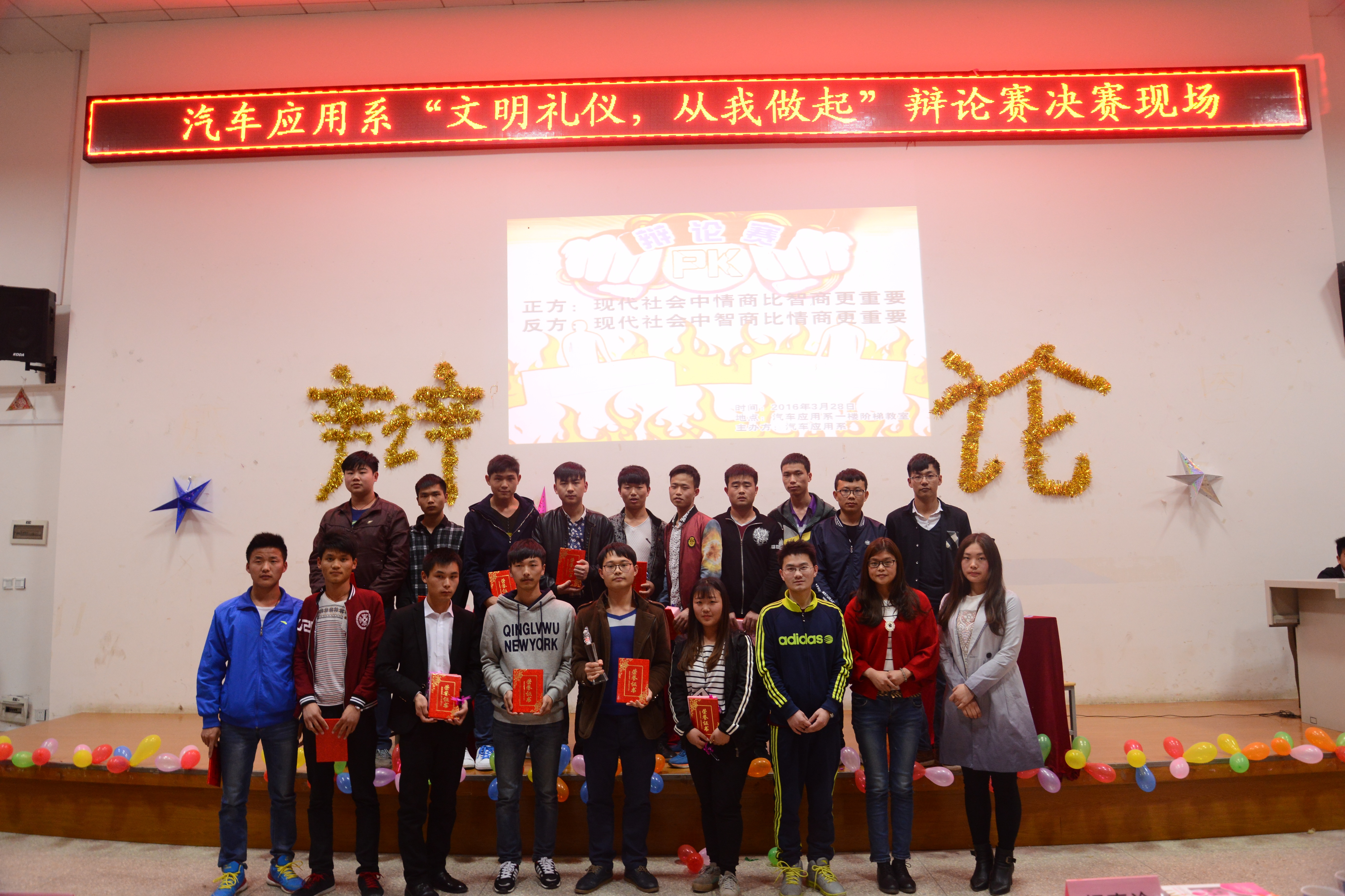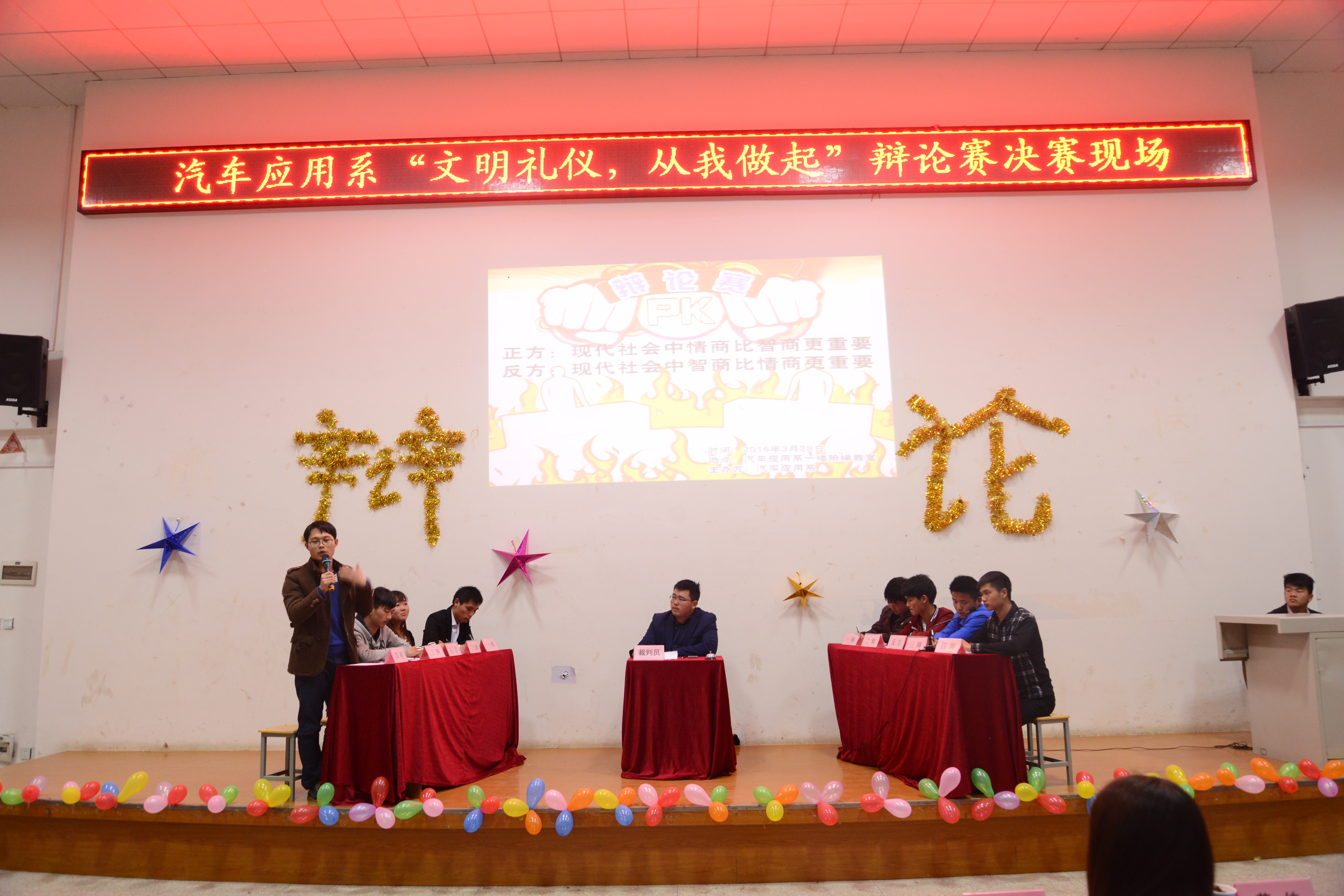 (通讯员:伍登丽)为了丰富校园文化生活,增强当代大学生的文明意识及思维应变能力,2016年3月,我院汽车应用系团总支主办的主题为“文明礼仪,从我做起”的辩论赛在6号楼一楼阶梯教室隆重举行,此次为期半个月的辩论赛得到了领导和老师们的大力支持,吸引了同学们的广泛关注,各班学生积极报名,踊跃参赛。