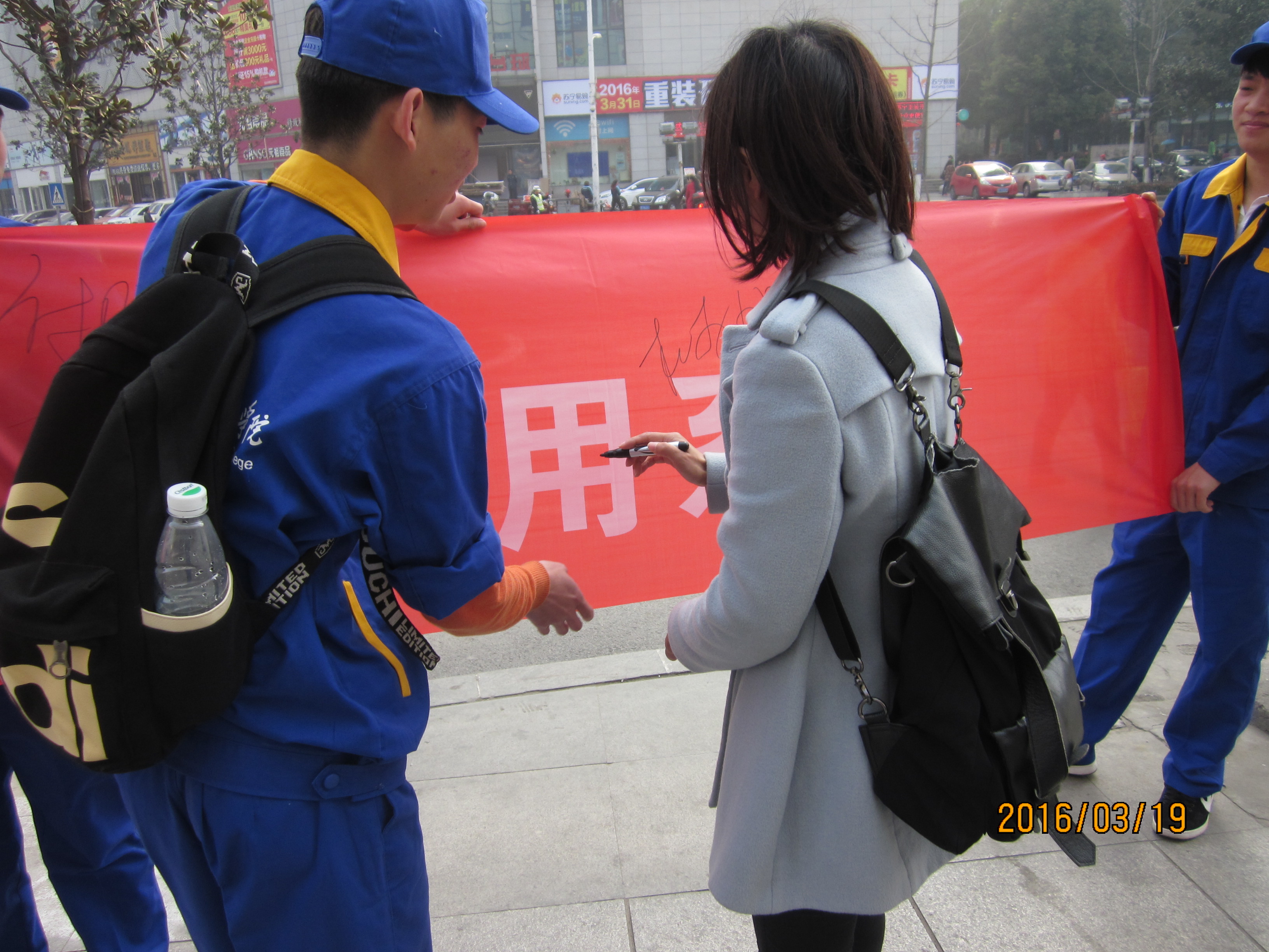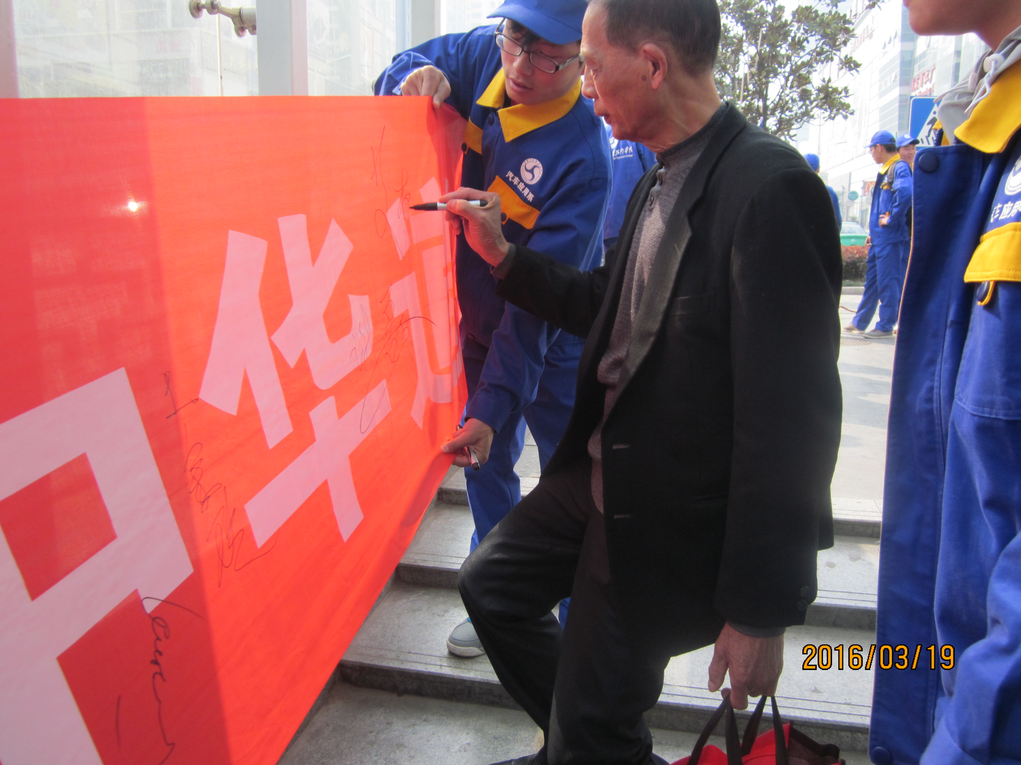 3月19日,为了响应“弘扬优秀中华道德文化,树立特色民族主义精神”的号召,汽车应用系志愿者们8点准时在学校大门口集合,并全体合影。本次活动的目的地在沃尔玛附近,志愿者们手持横幅,高举系旗,主动热情的和市民交流、积极帮助清洁阿姨、在公交站维护上下车秩序……很多市民朋友深受感染,纷纷在横幅上签名表示对志愿活动的支持和肯定。宣传结束后,看着密密麻麻的签名,每个人都感受到传承优良文化的责任感和荣誉感,用自己的实际行动诠释着永恒的雷锋精神。