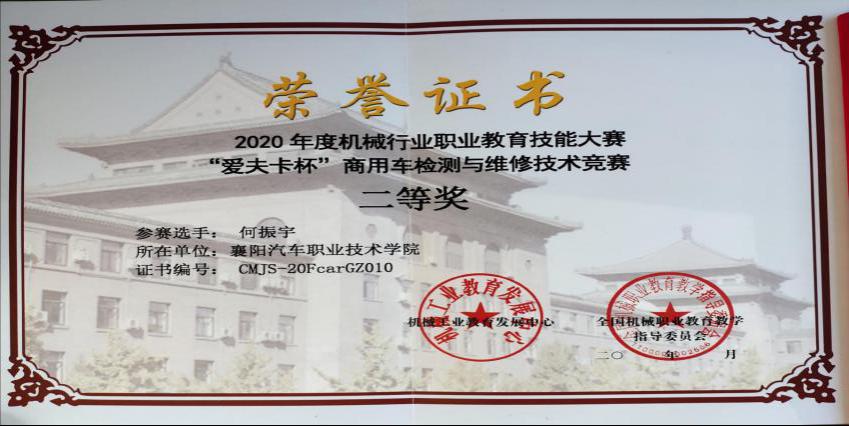 12月24日,由汽车工程学院何文杰和王平老师指导的汽车检测与维修专业学生何振宇和曹家烨2位同学在中国机械教育发展中心和全国机械职业教育教学指导委员会共同举办的2020年度机械行业职业教育技能大赛第四届“爱夫卡杯”商用车检测与维修技能大赛中,经过2天的激烈角逐,荣获全国二等奖。