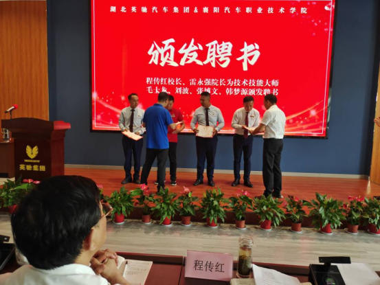 仪式上,学校副校长程传红和汽车工程学院党总支书记秦显峰为为聘请的企业“技术技能大师”颁发了聘书。