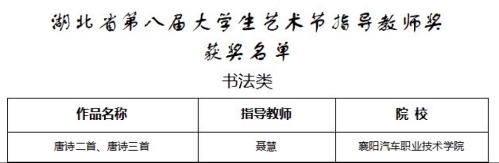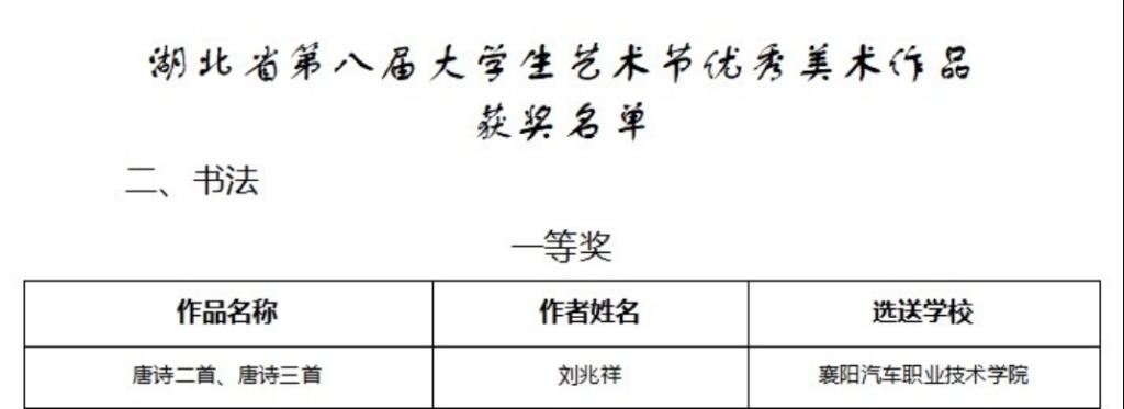 近日,湖北省教育厅公布关于湖北省第八届大学生艺术节优秀组织奖和“三优一案例”评选结果的通知,汽车工程(新能源汽车)学院新能源汽车专业2311班刘兆祥同学的“书法类”美术作品《唐诗二首》《唐诗三首》在评选中获一等奖,我院班主任聂慧获湖北省第八届大学生艺术节指导教师奖。