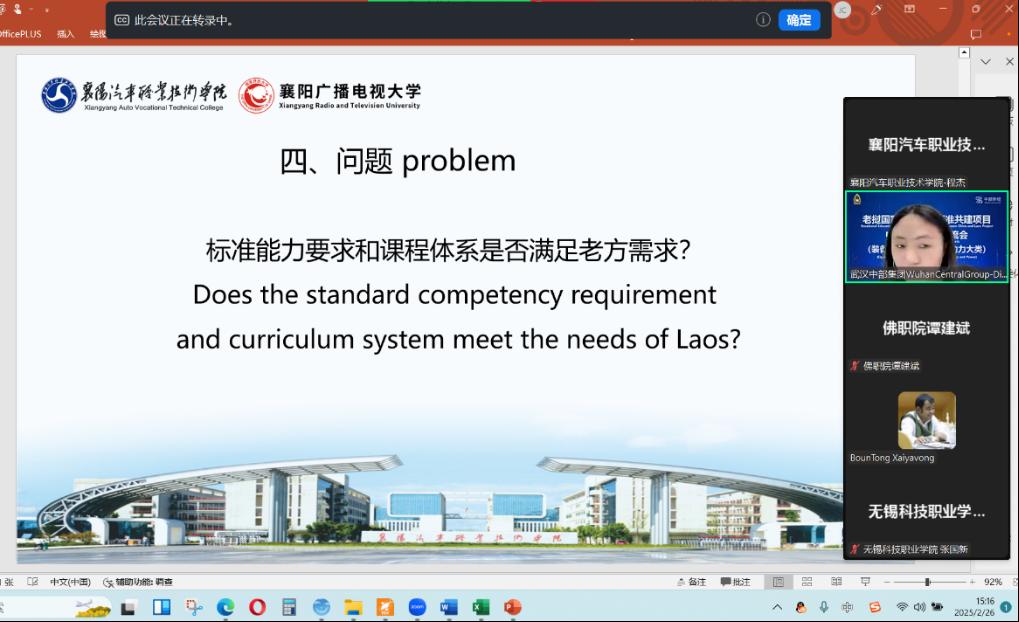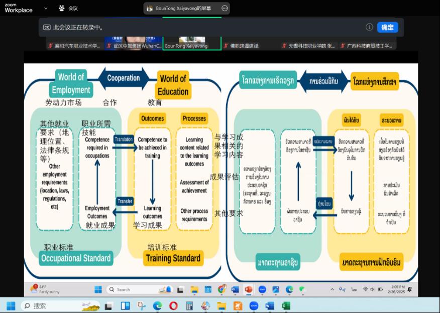 2025年2月26日,为了顺利推进老挝国家职业标准共建项目开发实施,在协办单位组织下,通过线上会议平台参加了中老专家研讨交流会。会议邀请中国各参建院校介绍本校项目开发思路,同时邀请老挝教育体育部、相关行业主管部委官员以及老挝知名高校和行业企业领导等专家,针对老挝行业发展现状以及人才需求情况进行介绍,为参建院校的项目开发工作提供指导和支持。