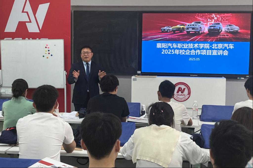 2025年5月16日,为深化产教融合,推动汽车行业高素质技能人才培养,北京汽车与襄阳汽车职业技术学院联合举办的2025届“北汽营销班”定向培养项目宣讲会在实训基地C-105举行。北汽销售公司渠道运营部培训科校企合作项目负责人由敬忠、北汽销售公司渠道运营部培训科校企合作项目负责人夏升、襄阳万诚总经理杜亚中、汽车工程(新能源汽车)学院院长秦显峰及新能源汽车技术研究室老师参加宣讲会,会议由副院长郭建青主持。