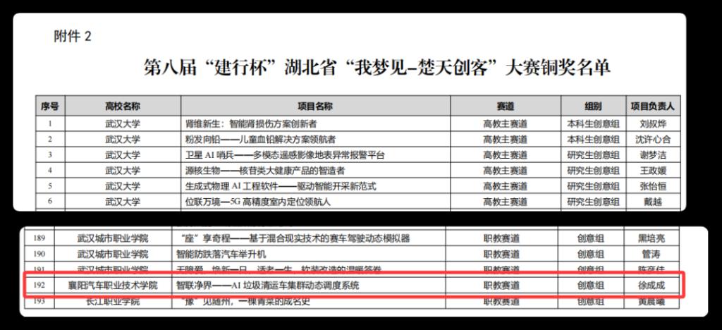 近日,“建行杯”第八届楚天创客大赛落幕,我校汽车工程学院汽车电子技术专业学生徐成成、吴远杰等学生从全