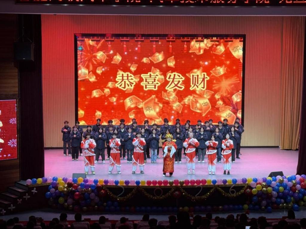 晚会过程中还穿插了互动答题猜谜环节,趣味十足的游戏与丰厚的奖品让现场氛围持续升温,欢声笑语不断。最后,晚会在演职人员与现场师生共同合唱的《西楼别序》中圆满落幕,悠扬的歌声回荡在会堂上空,承载着对新年的美好憧憬与深切祝福。
